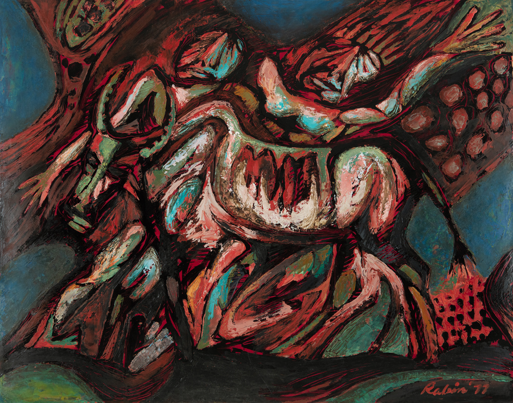The 1970s was a decade when Bengal had to revisit the issue of the political border—for the third time in the twentieth century—when the country of Bangladesh was created from the erstwhile Bengal province of Pakistan, after a war in 1971. The monumental event unleashed a new wave of displacement, which saw refugees spilling into the Indian side of the border and Calcutta bore the brunt of it. Rabin Mondal, who had already matured his individuated syntax of expressing the ills of the society through his primitivist figuration style, responded with several works giving a grim depiction of the displaced people, of which this work is an example.