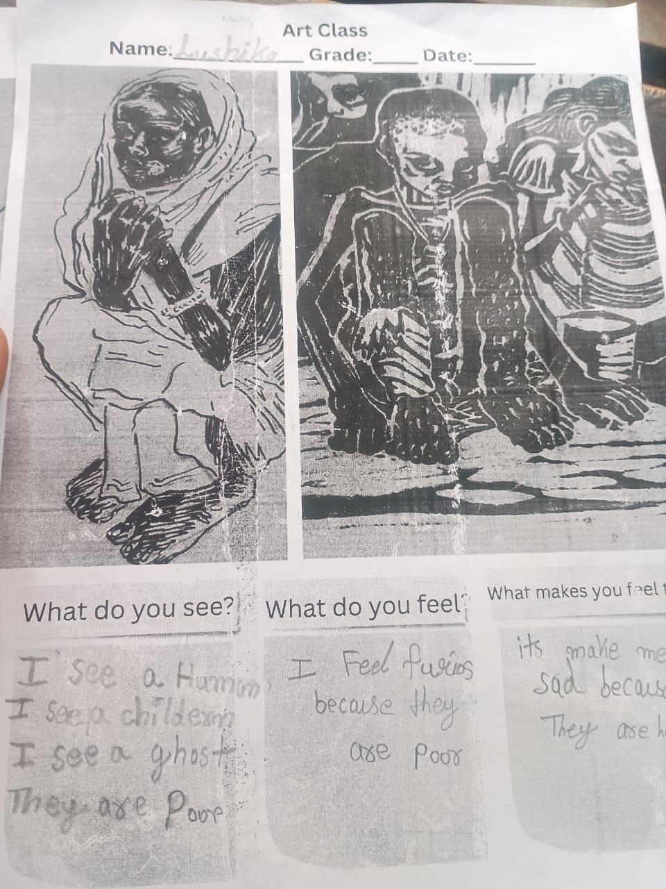 Subham chose not to use images from Gaza, but instead drew from another moment of human suffering — the Bengal Famine of 1943. During this period, artist Chittaprosad travelled across Bengal documenting the lives of the famine-stricken, and these works went unpublished at the time due to British censorship. One particularly striking image Subham used was an untitled linocut print by Chittaprosad depicting three starving children in Cox’s Bazaar (now in present-day Bangladesh), their frail bodies marked by extreme malnutrition. Displaying these images on the board and distributing them as worksheets for silent reflection, Subham asked his students three simple yet profound questions: after identifying what they were seeing, how did the images make them feel, and why did they think they felt that way?