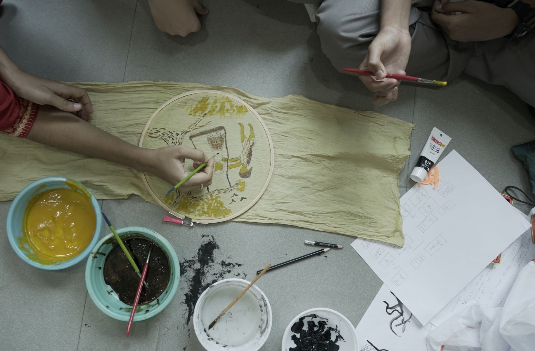 Stepping into the shoes of researchers, artists and curators, students were introduced to the structure of the exhibition, the charkha frame, and their task at hand—working in five groups to create five textile scrolls, each depicting one strand of the freedom struggle. The characters from the paintings they had studied would come alive in these scrolls, each made with a different printing, stitching or dyeing technique. Reflecting on the process of developing their characters, balancing fact and fiction, creating their storyboards and transferring their narratives onto the scrolls, students mentioned they enjoyed the freedom of shaping their own point of view on the past. They also appreciated having the liberty to fail. While working in groups, things were certainly not always peaceful and things did not go according to plan. While working with difficult processes like linocut, they struggled to get the paint on fast enough for the imprint to appear clearly on the fabrics, and amidst days of heavy rainfall, the group working with cyanotype had difficulty with calibrating the exposure and had to redo their scroll. However, they found ways to organize themselves and work through the challenges, and the small wins along the way propelled them towards completing their final projects. |