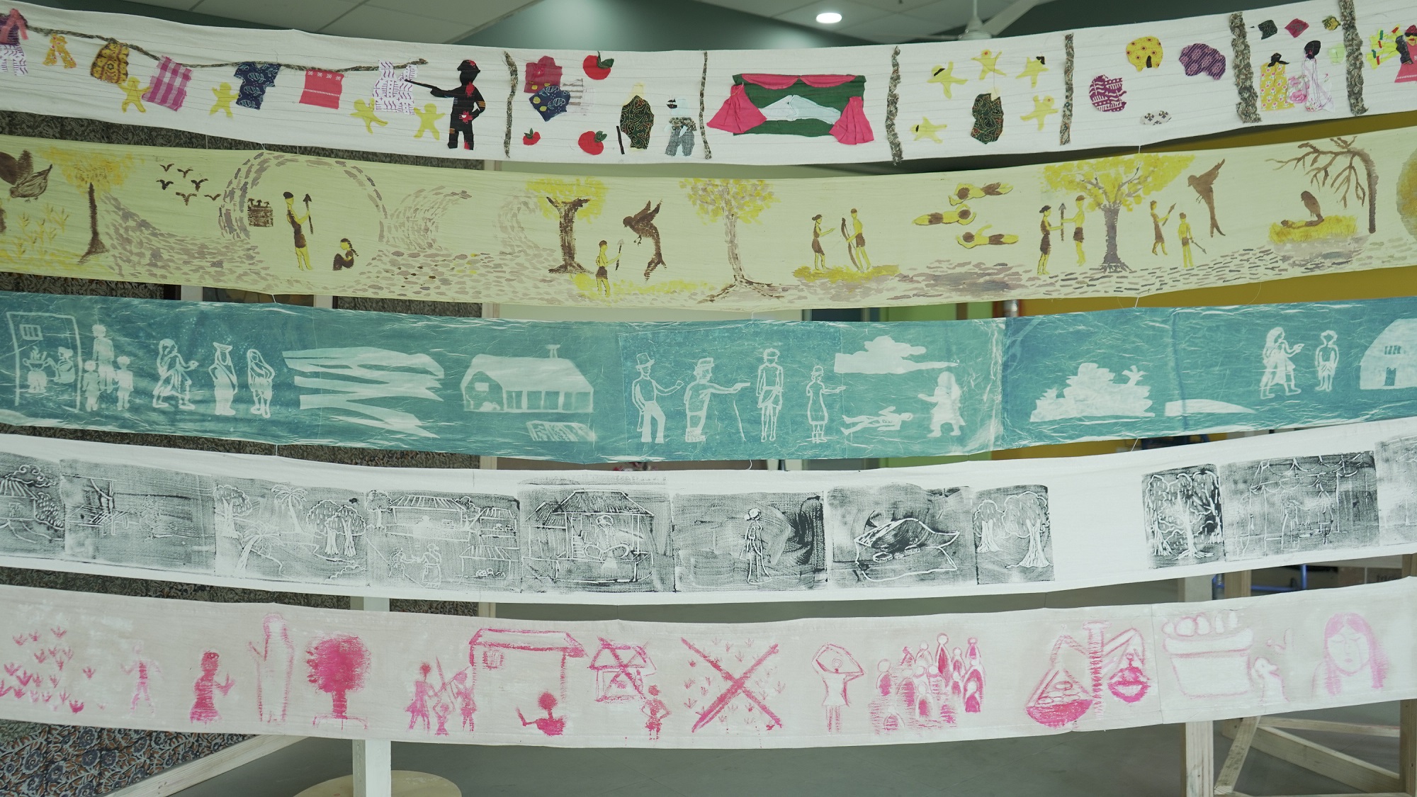 A charkha-like display was developed as the framework for the exhibition to evoke the theme. This would hold a collection of artworks from the DAG collection along with five textile scrolls created by students, that come together across the frame to represent the various strands of the freedom movement and the complex stories of textiles in the subcontinent. A map of colonial fabric trade routes, from India to the U. K., Africa and Japan would dot the floor as an interpretive layer, setting the broader historical context. |