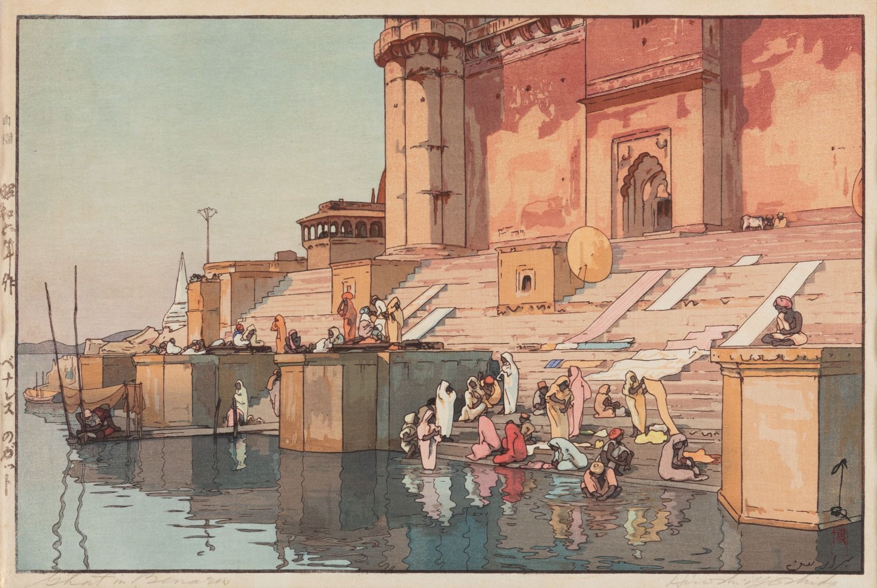Japanese painter-printmaker Yoshida Hiroshi was an avid traveller and visited India in November 1930, spending the next few months sketching and making notes. He returned to Japan after four months and produced exquisite prints of scenes from his trip. Benaras, as expected, was on his itinerary and he paid tribute to the vibrant city with this woodblock print. It’s a busy ghat, possibly extremely early in the morning when the ghat is not as crowded as later in the day, as the first worshippers pay homage to the rippling, once clear, waters of the Ganges. Benares’ array of forts loom behind them, once bustling with people – now empty.