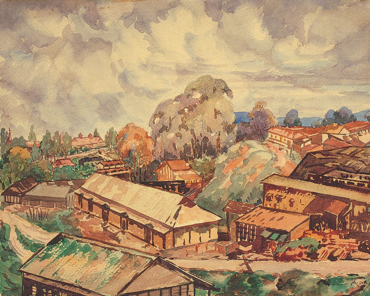Born in Sivasagar in Assam, Hemanta Misra started painting landscapes that he saw around him from a very young age. It’s the sleepy town of Shillong, painted at a time when Shillong, but not Guwahati, was the capital of Assam when Meghalaya and Assam were undivided. The skies are cloudy, and it will probably rain in a while over the quiet houses painted with thick strokes in a bright colour palette to echo holiday town, from which no one has stirred just yet.