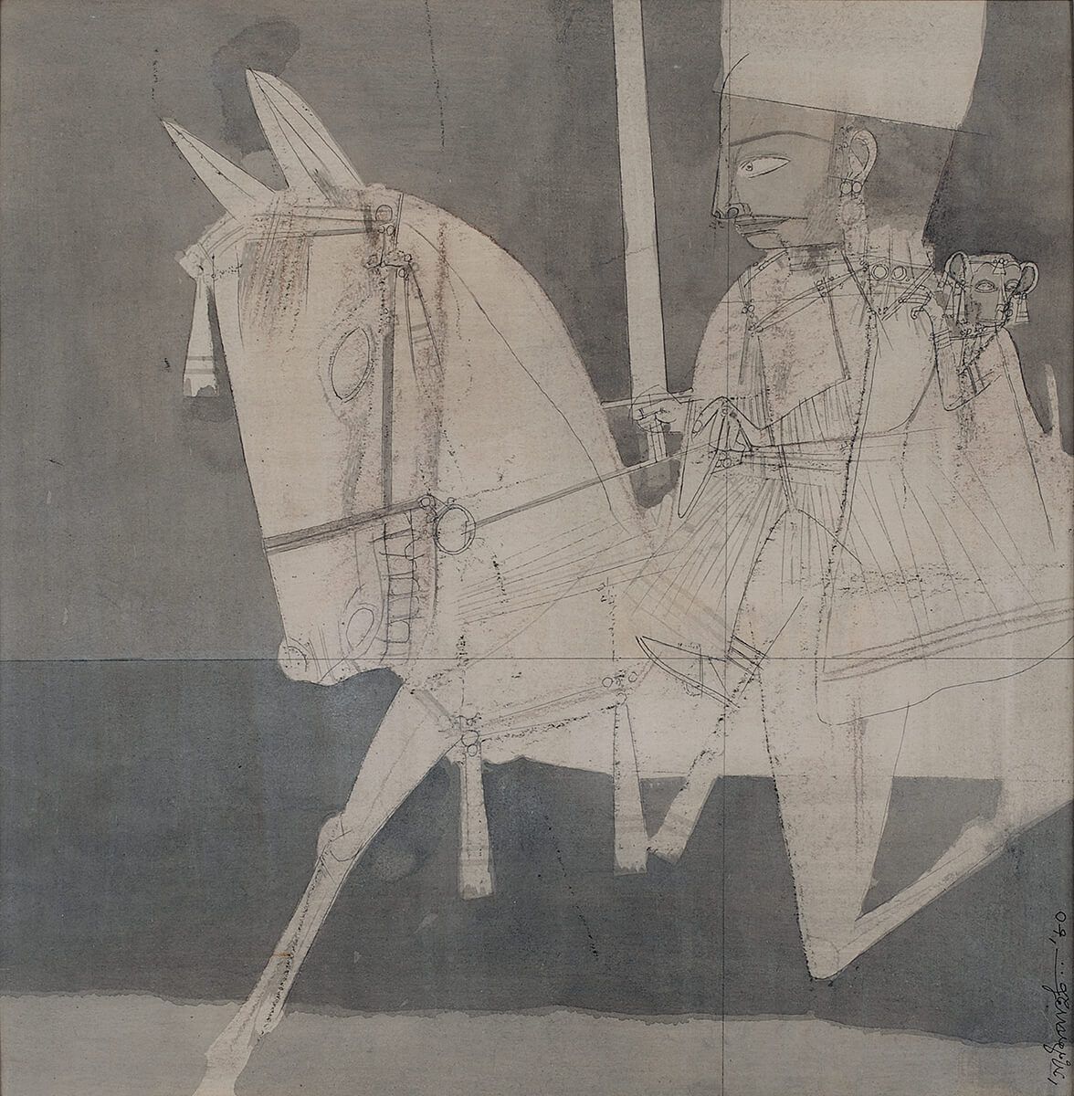 He frequently turned to myths, fables and fairy tales for artistic inspiration—including stories he had heard from his grandmother. However, in his work you can feel the disquieting shadows that may have been residues of the horrors he saw around him in his growing years during the 1940s. In this painting, a man astride a horse appears to be on an enigmatic journey of destruction, much like Lawrence’s ‘rocking-horse winner’ Paul who rides his horse into a hypnotic state of mind to predict horsing game winners. Both Paul and this rider are surrounded by darkness, eyes sharp in their single-minded motive to fulfill their purpose.
