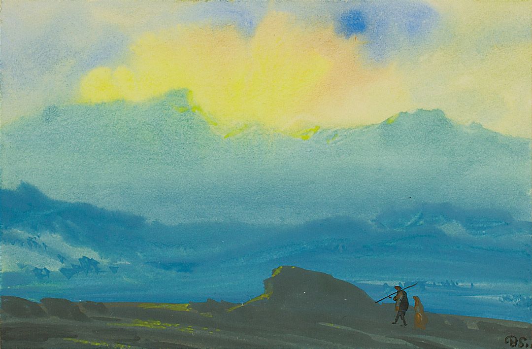 Bireswar Sen’s ability to paint the expanse of the Himalayas in a minuscule format was his greatest strength as an artist as well as an ode to the artist whom he admired most—Nicholas Roerich. Sen’s small watercolours were, however, rich in details. In this landscape, a man accompanied by a smaller figure, walks past a rocky outcrop against a background of high mountain peaks. The sun shines dimly above the mountains, alerting the figures to the oncoming of daybreak, as they walk on. Below them lies a valley asleep, the river glinting as it flows near sparse trees lining its banks.