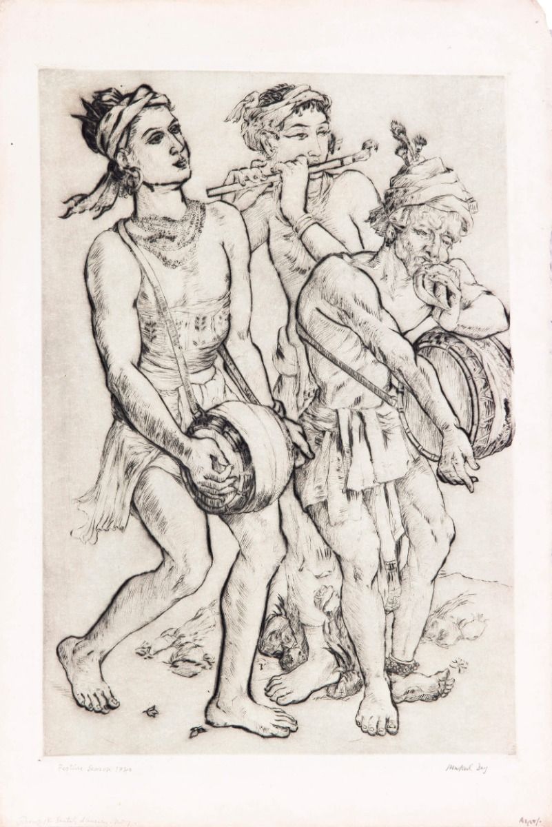 Mukul Dey Festive Season / Group of Santhal Dancers year 1940 size Print size: 13.7 x 9.7 in. / 34.8 x 24.6 cm. medium Drypoint on handmade paper published references |