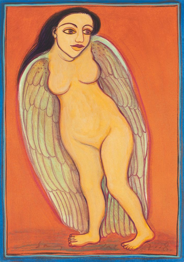 Among the many hybrid creatures that Gogi Saroj Pal has painted over the decades, the most loved are her birdwoman composites, referred to as kinnaris in ancient Indian texts. While their male versions, kinnaras, are regarded as celestial musicians and are represented in sculpture and art throughout the Indian subcontinent and Southeast Asia, Pal’s kinnaris suggest the freedom that wings bequeath to a woman—even if only in imagination—the ability to fly free even when bogged down by the banality of the chores of one’s lives.