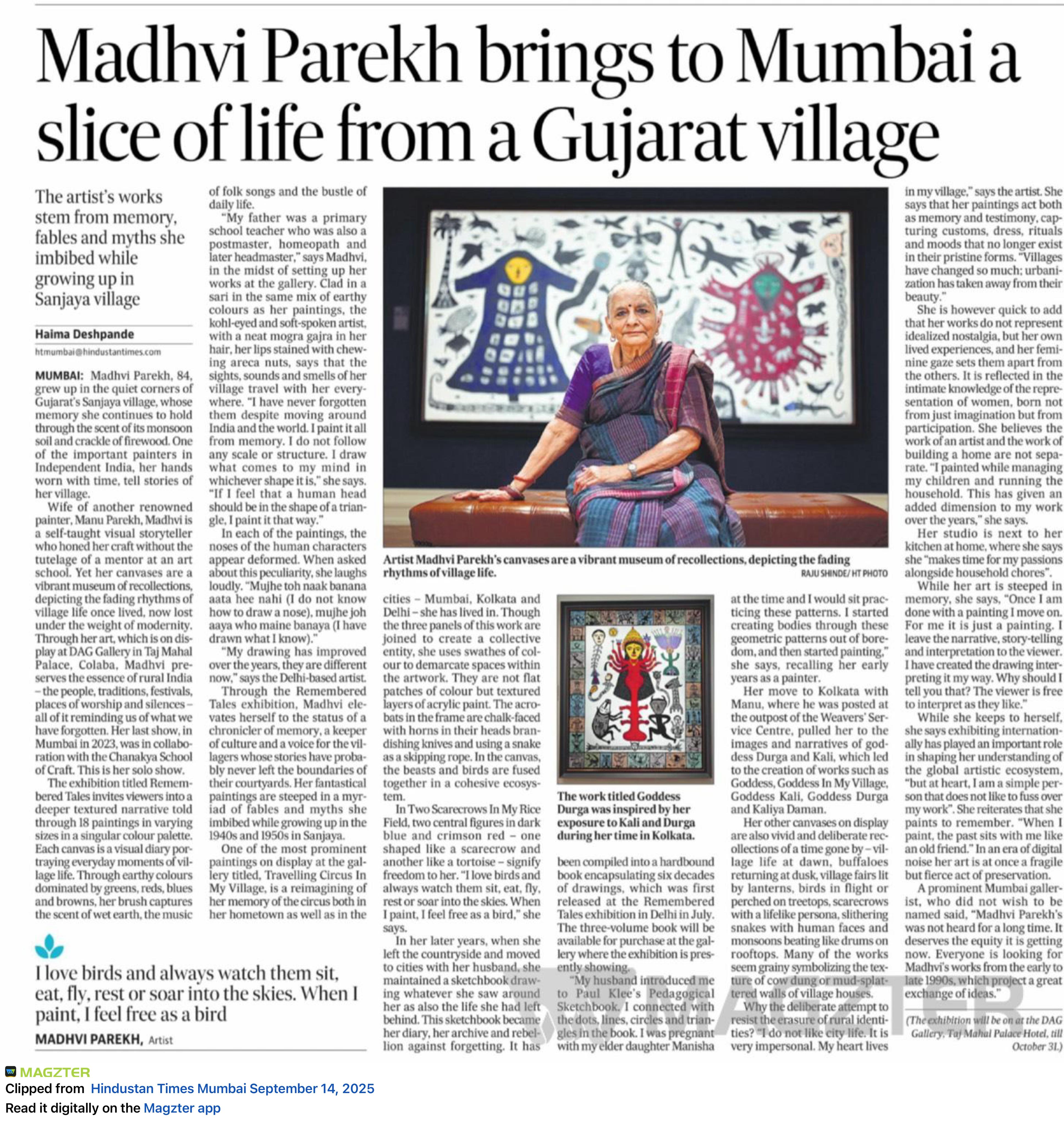 | I have never forgotten the sights and sounds of my village; I carry them with me everywhere, and although they are often combined with elements I have imbibed living in the city, they still endure. – Madhvi Parekh |