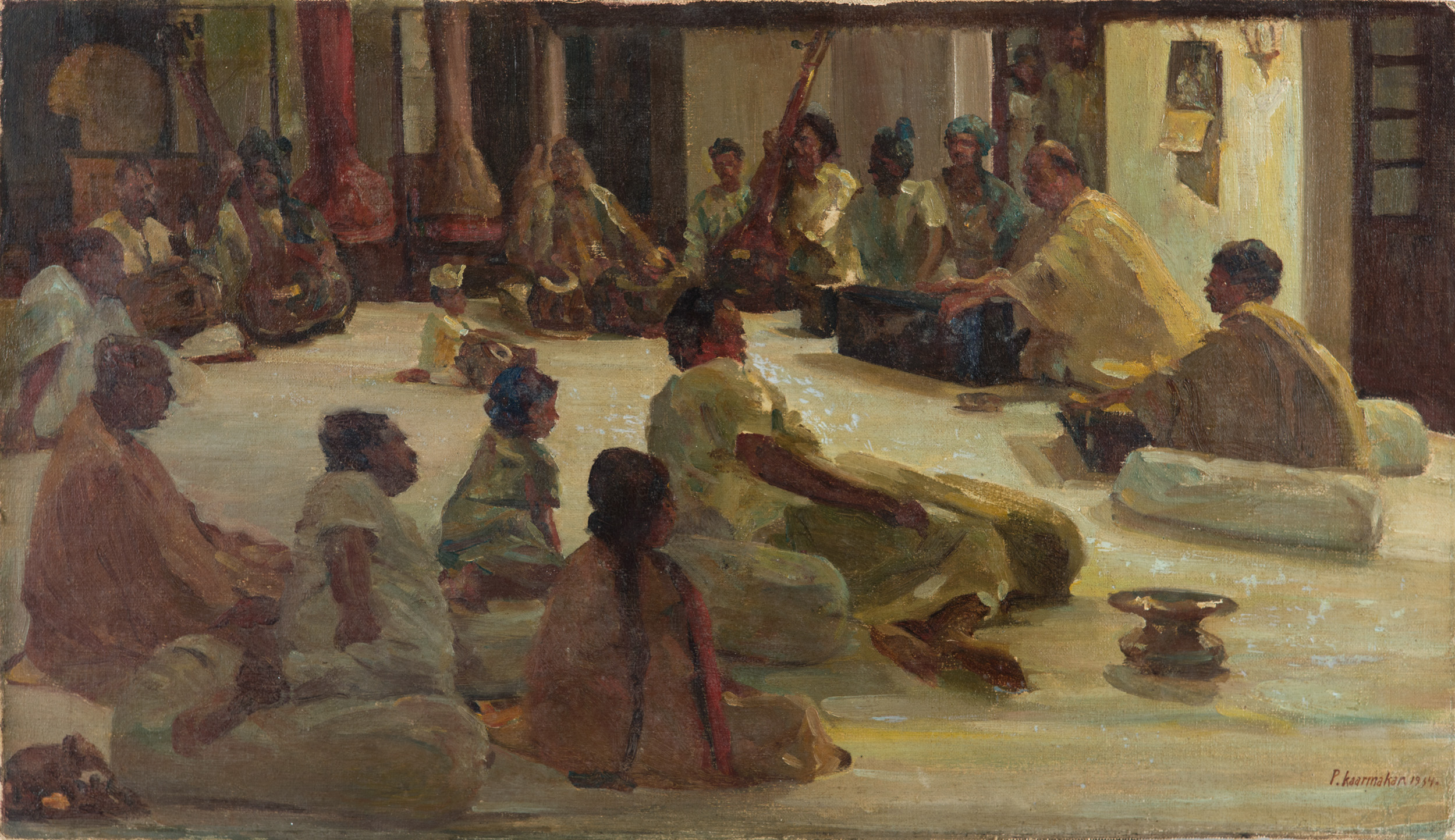 This postcard, produced by The Phototype Company, Bombay presents four women seated with three male musicians. The Phototype Company was a prolific producer of postcards in the early 20th century—printing postcards by other companies while also creating their own with images usually depicting views of Bombay or cultural scenes. The women are draped in sarees and minimal jewellery which also diverges from the popular visualisations of performers in the early twentieth century. The caption, Singing Party, seemingly clarifies the logic of divergence by identifying those depicted as singers and removing the association of dance from the largely overlapping categories that constituted performance. Due to long exposure times, it would be impossible to capture performances in motion and therefore performers were staged or made to pose. |