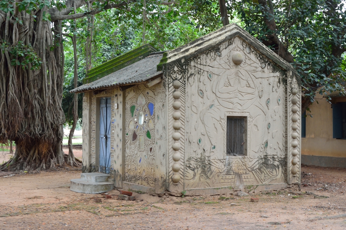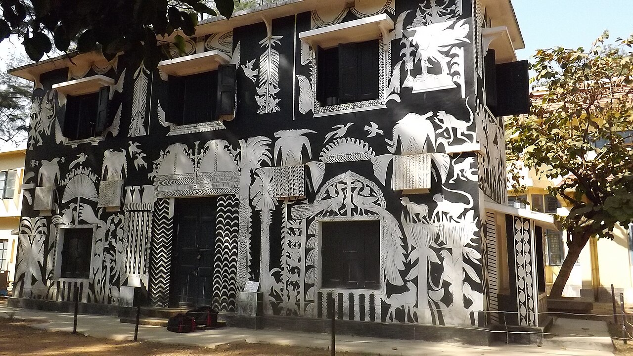 To the West of Singha Sadan, the road takes one to the precincts of Kala Bhavana and Sangeet Bhavana. Standing as a sentinel at this creative crossroads is the Kalo-Bari – a quintessential example of Santiniketan's material experimentation. Its striking black exterior is coated with a mixture of tar, manganese, and albumen (egg white), and its walls are adorned with Bharhut, Mamallapuram, Harappan, Assyrian and Egyptian folk and archaeology-inspired bas-reliefs created by students under the guidance of Ramkinkar Baij and Prabhas Sen, among others. The campus is a living open-air gallery, dotted with murals from different phases of its history by artists including Somnath Hore, Benode Behari Mukherjee, K.G. Subramanyan, Rudrappa Hanji, and Radhacharan Bagchi, while the great monumental sculptures of Ramkinkar root the entire experience in a powerful, three-dimensional presence. Architecturally, Kala Bhavana evolved by constructing newer spaces and studios, according to the needs of teachers and students. |