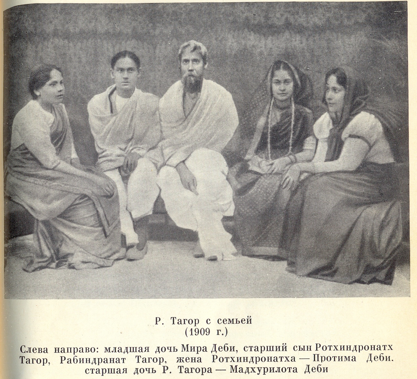 Rabindranath Tagore with family. Left to right: youngest daughter Mira Devi, eldest son Rathindranath Tagore, Rabindranath Tagore, Protima Devi, and the eldest daughter of Rabindranath Tagore, Madhurilata Devi
