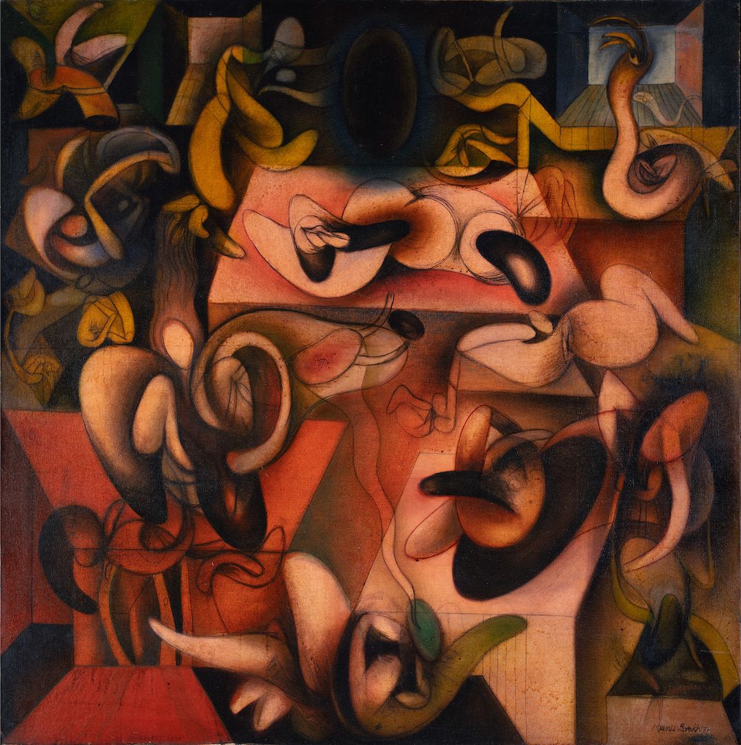 Perhaps best known for his Banaras series, New Delhi-based Manu Parekh has experimented with colourful abstractions, sexual imagery, and figuration. In Shiva, a work that he created when he was living in Calcutta, the forms variously manifest the lingam and the yoni(the male and female principles). While the narrative is erotic, there is a certain rhythm in thepainting’s composition. The use of black and red is a nod to Kali, and by extension, to her counterpart, Shiva, making this work an ode to the union of Shiva and Shakti in mythology, which lies at the base of all creation, and ultimate dissolution of the earthly beings with the Universe or Brahmand.