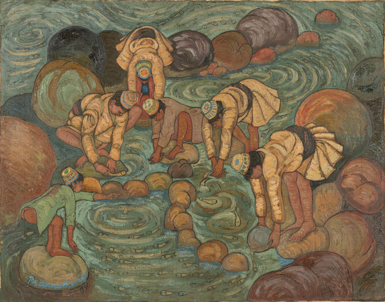 Untitled (Catching Fish) P. N. Mago Trained at the J.J. School of Art, P. N. Mago grounded his early practice in close observation of the everyday lives of working people. Informed by his own experience of the Partition and migration, works such as Untitled (Catching Fish) register themes of survival and resilience within a society undergoing profound change. His subsequent training at B. C. Sanyal’s studio expanded his engagement with murals and decorative arts, enriching his artistic vocabulary and scope for exploration. A founding member of the Delhi Silpi Chakra, Mago was also a respected author and educator, whose contributions to art and society remain significant. |