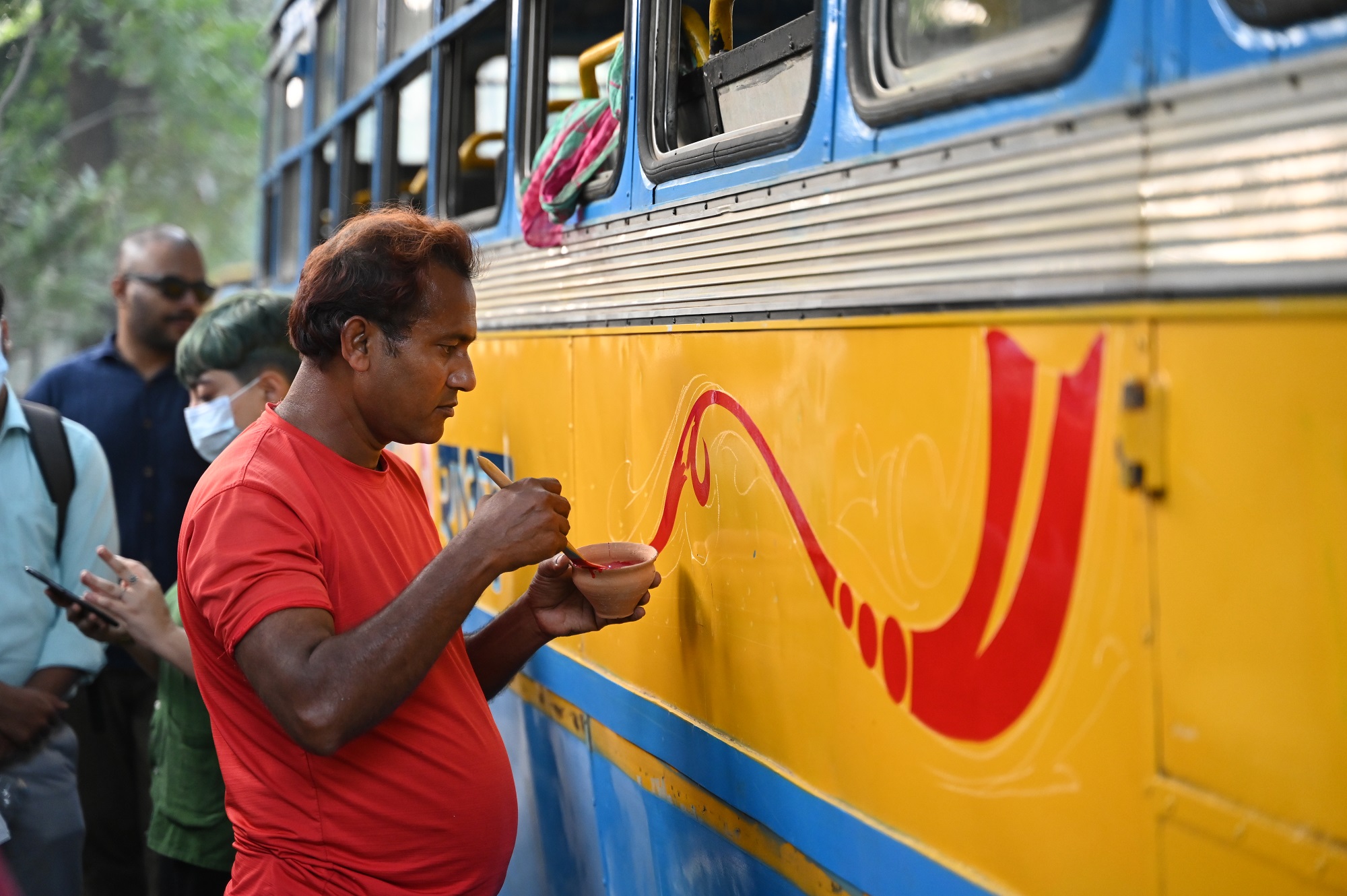 Yellow, Blue and Art on the MoveOn the seventh day of the festival, we gathered at the Esplanade Bus depot in central Kolkata to observe something that we see every day, but do not look closely at – bus art. The artist Sumantra Mukherjee introduced us to the concept of vehicular art, which takes the form of artistic interventions on government stipulated yellow and blue coloured buses that ply the city. city. We were also joined by the bus artist Bazlur Rahaman, who explained the concepts behind various motifs on the bus and the different ways in which drivers personalise their vehicles, almost as if it were their own room. He demonstrated this by painting the word ‘Pilot’, which is typically written under the driver’s window, and transforming each letter into miniature figures of umbrellas, hand fans and cricket balls. |