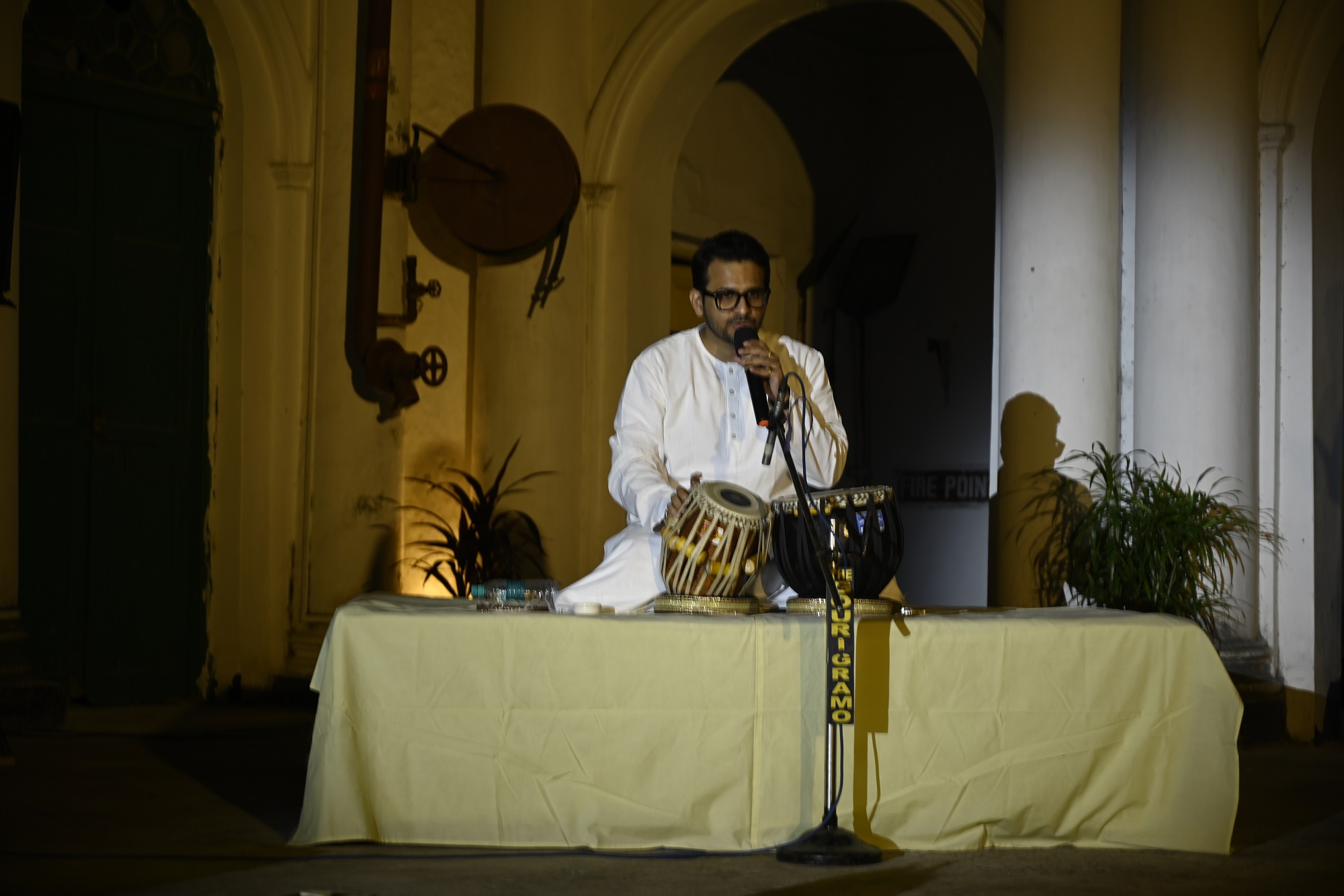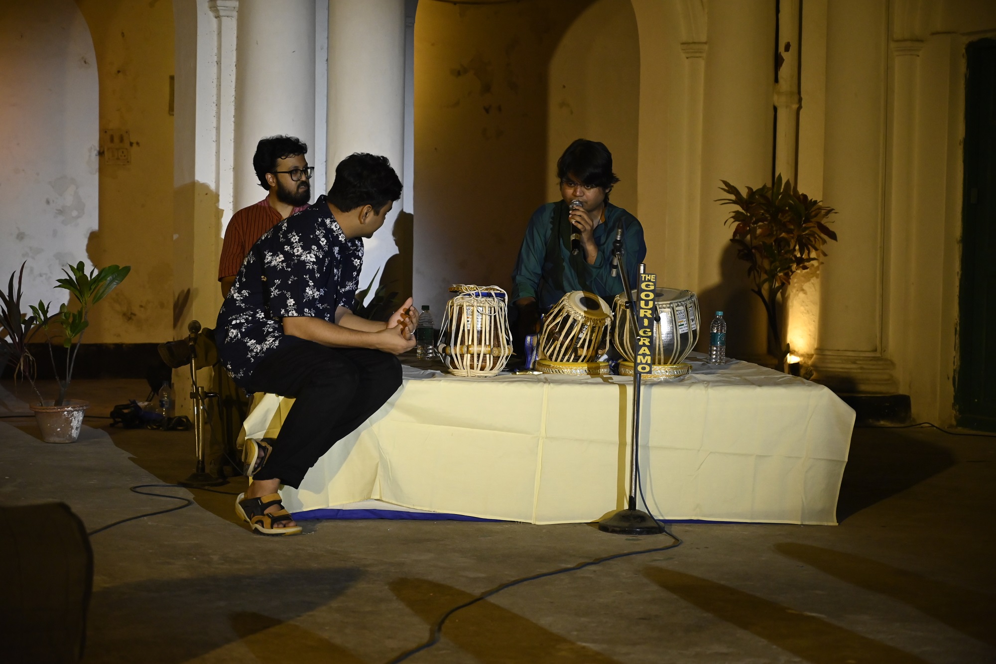 Gab-Sur-KinnarThe third edition of ‘The City as a Museum’ came to an end with a tabla concert at the historic building of Jorasanko Thakurbari. Curated by the sitarist Subhranil Sarkar, tabla artists Rohen Bose and Asif Khan spoke about the history and nuances of their own gharanas, namely the Benares and the Farrukhabad gharanas respectively – focusing on tabla-making, patronage, courtly practices and instrument design as an evolving practice. This was accompanied by a short film where Shyamal Das demonstrated the different stages of tabla making in his workshop in Kolkata. The concert came to an end with Bose and Khan coming together in a ‘sangat’ with Alla Rakha Kalawant on the sarangi. |