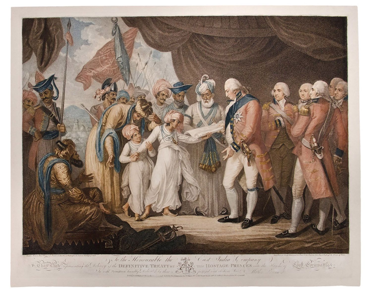 Daniel Orme The Delivery of the Definitive Treaty by the Hostage Princes into the Hands of Lord Cornwallis year 1793 size 20.0 x 25.0 in. / 50.8 x 63.5 cm. medium Stipple engraving, tinted with watercolour on paper |