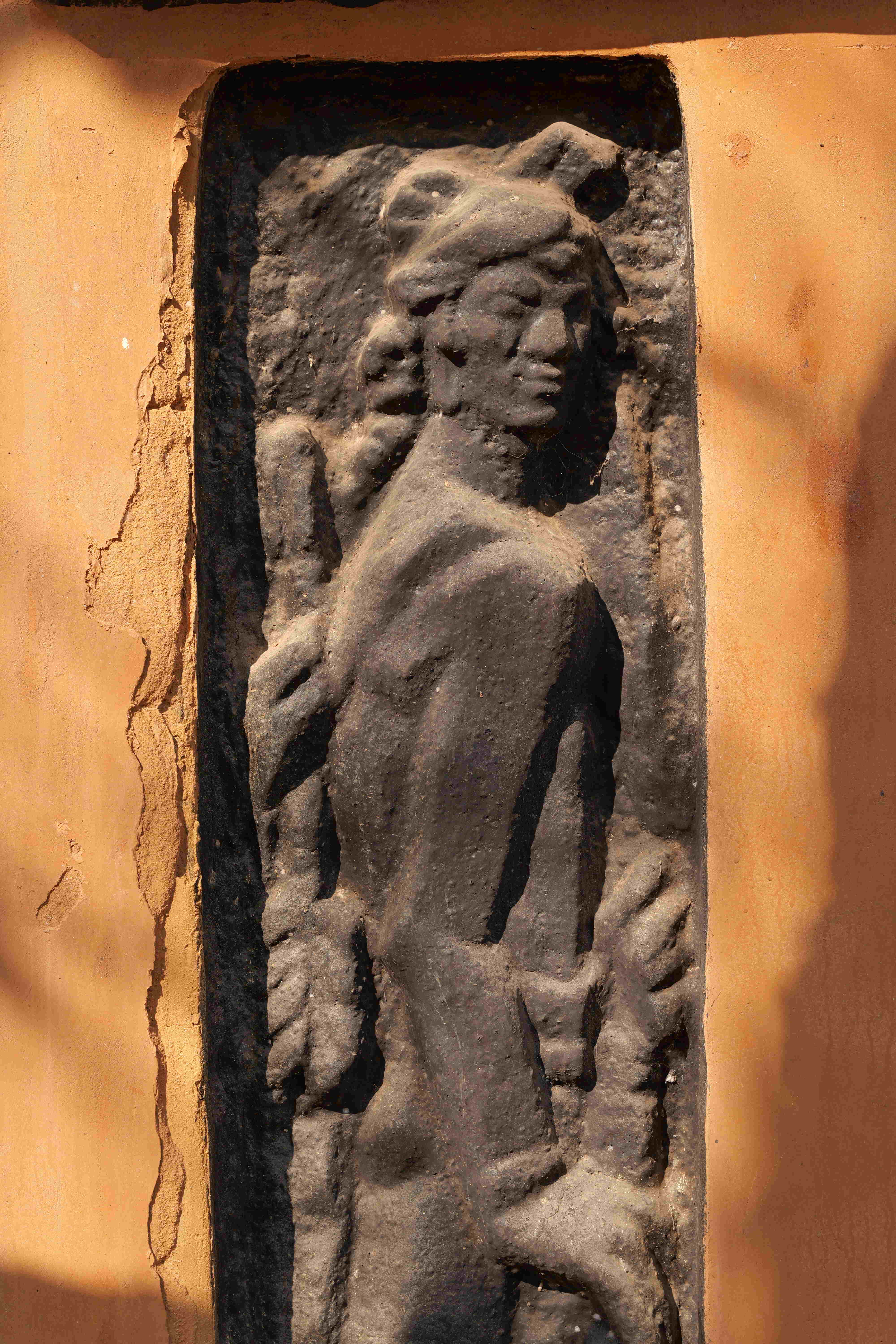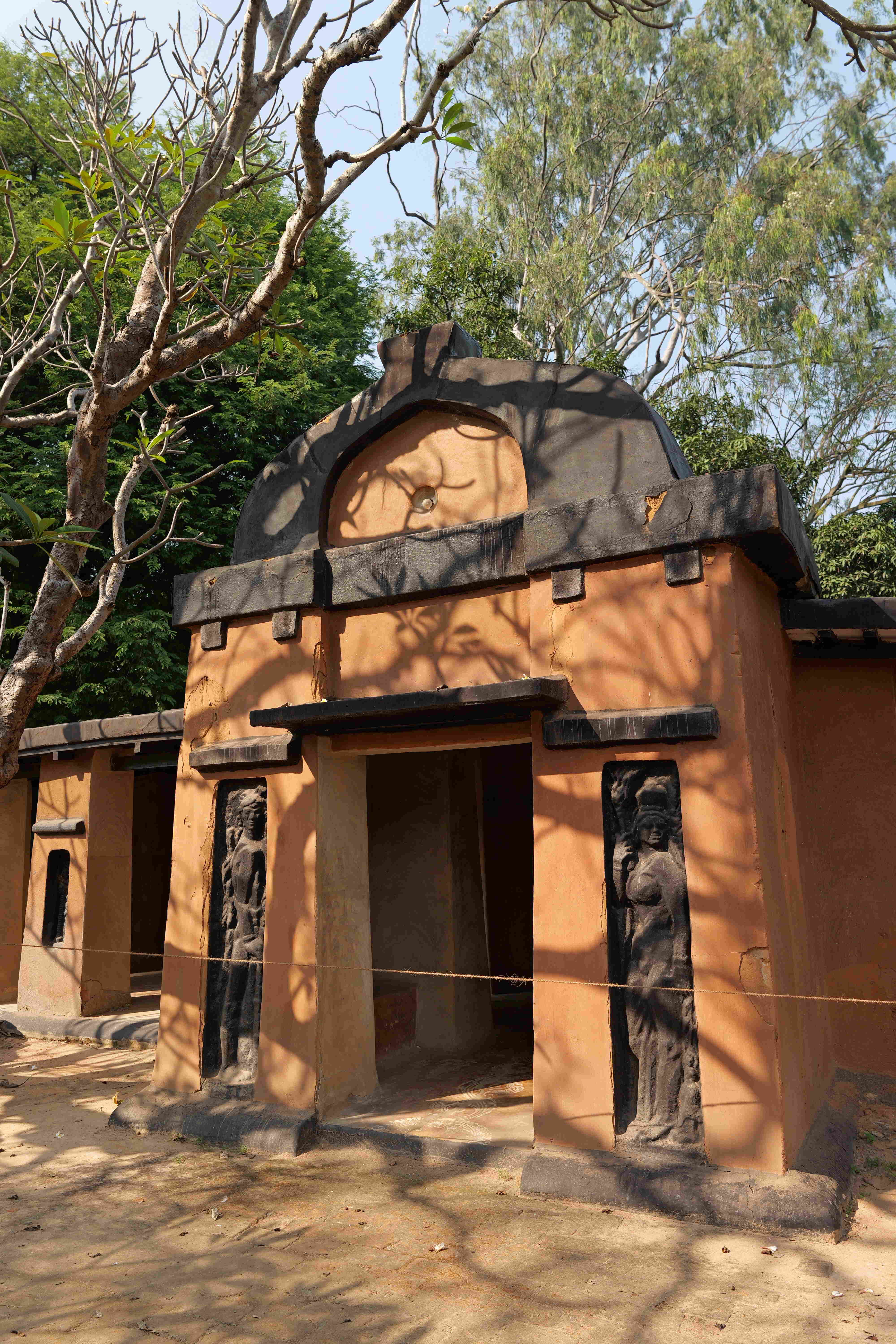 In a spirit of experimental revivalism, within the Uttarayan complex Santiniketan’s architect and design team turned to the enduring prototype of the Buddhist chaitya hall, akin to those at Ajanta and Bagh. This exploration culminated in Shyamali (The dark one, 1935), a name derived from its construction from locally sourced mud, with the earlier Chaitya (Chaiti) serving as its direct pilot project. Its frontal façade and structural plan faithfully echo the chaitya form, characterized by a solid mass with few openings. The surface is animated by numerous relief sculptural panels by Ramkinkar Baij and Nandalal Bose. |