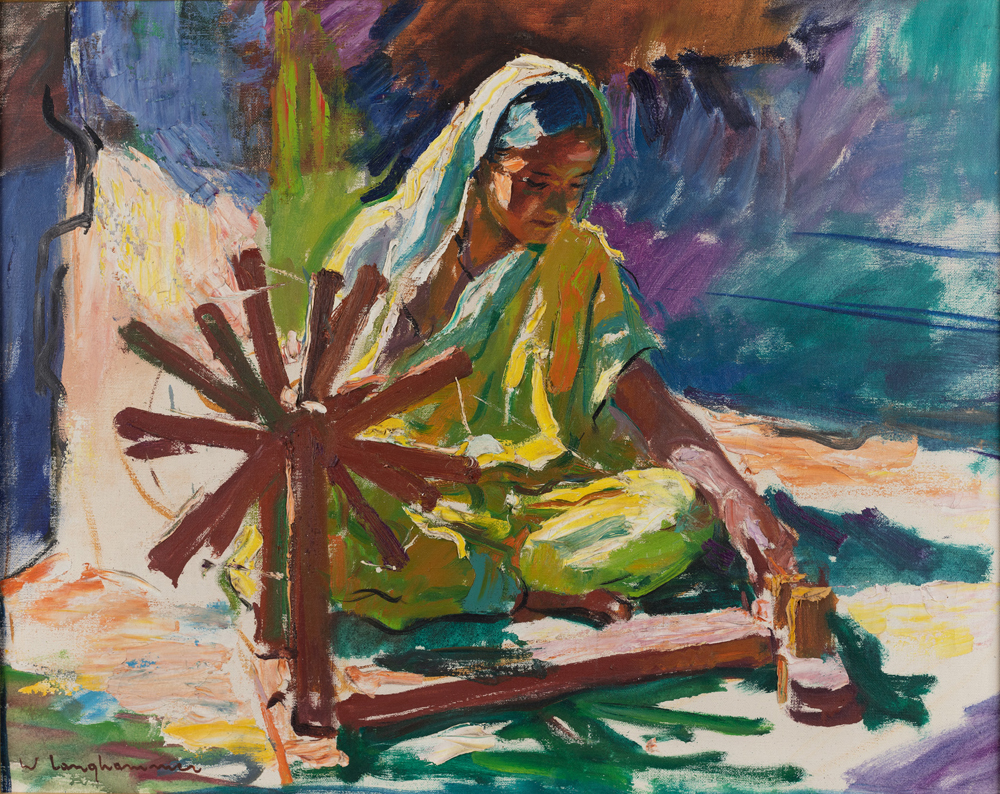 In 1939, Walter Langhammer received the gold medal of the B. A. S. A young diplomat-journalist, Langhammer emigrated from Austria to Bombay in 1938, and joined as the Art Director of the Times of India. He continued painting with rejuvenated inspiration from Indian society, albeit executed in his markedly Expressionistic style. Langhammer, together with Rudolf von Leyden and Schlesinger (both of whom served as jury members to the B. A. S.), changed the landscape of art criticism and appreciation in the city. Young artists found mentors in these figures, who constantly nurtured their curiosity, encouraging fresh art school graduates to explore contemporary artistic trends worldwide. Langhammer was particularly captivated by the country’s vibrant colours, dynamic political movements, and the active participation of ordinary people. In his painting of a woman with a spinning wheel (charkha), both the use of color and the expressive style reflect his deep connection to grassroots politics and the lives of common people.